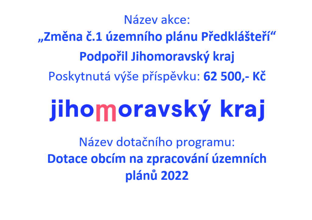 Obec získala dotaci na Změnu č. 1 územního plánu Předklášteří z dotačního titulu JMK s názvem: Dotace obcím na zpracování územních plánů 2022 ve výši 62 500 Kč.